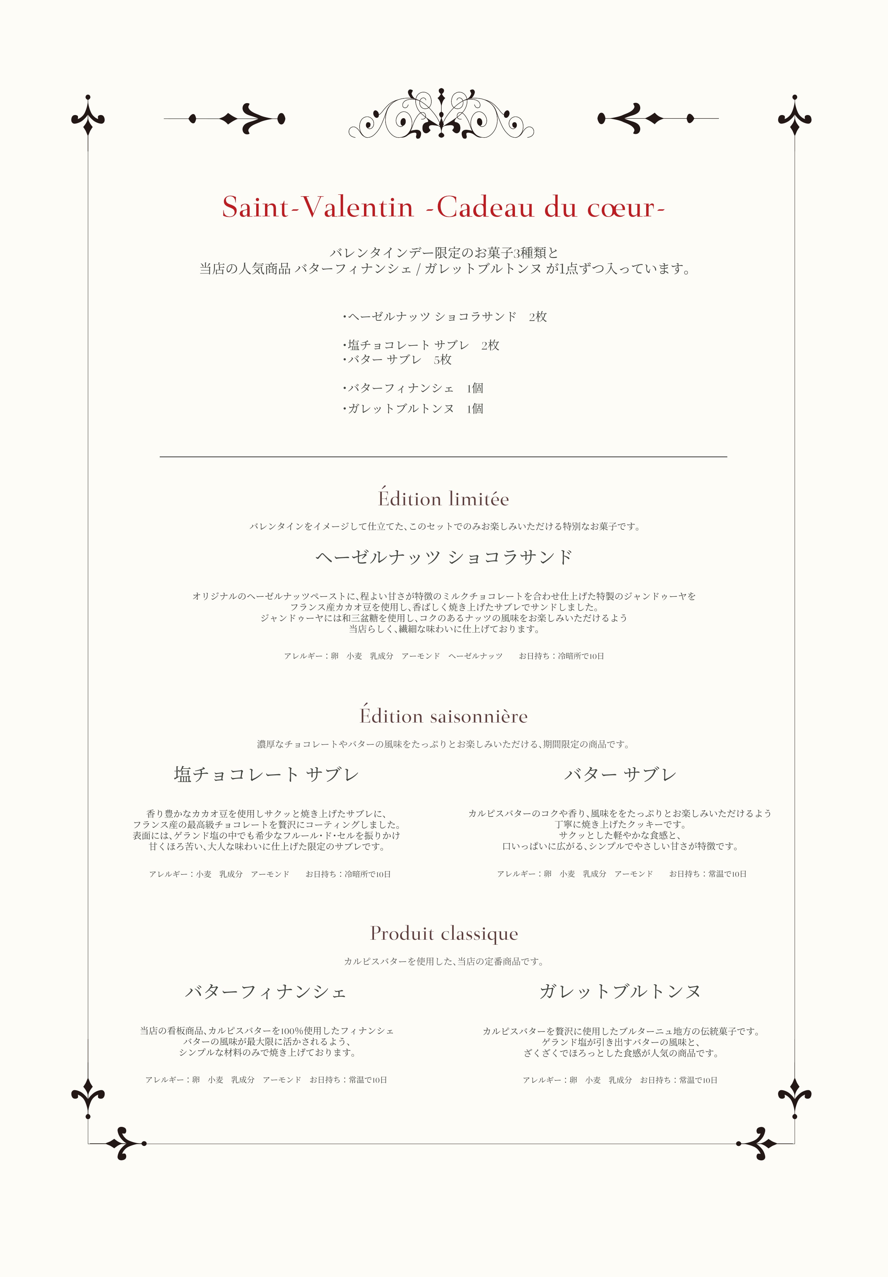 アレルギー : 卵・乳成分・小麦・アーモンド・ヘーゼルナッツ